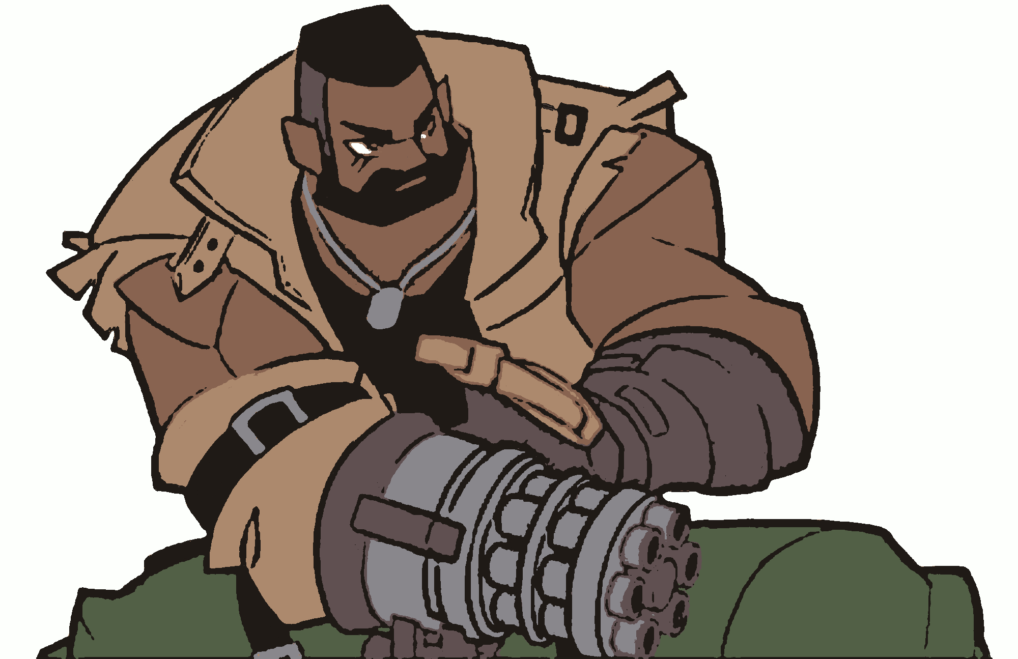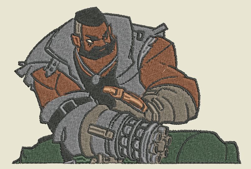 This custom embroidery design and pattern features the character Barret Wallace as he shoots from the video game franchise Final Fantasy.