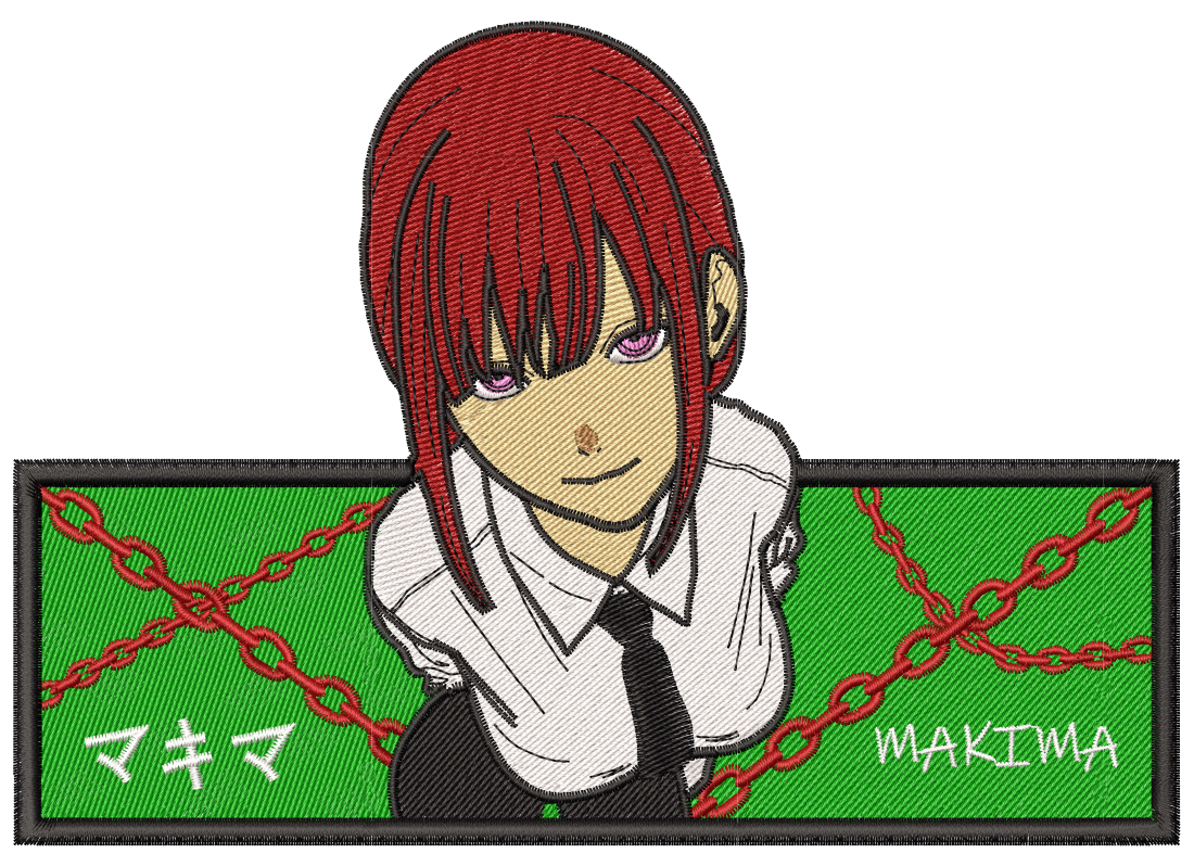 This custom anime machine embroidery design and pattern features the Chainsaw Man character Makima as she is chained and box.