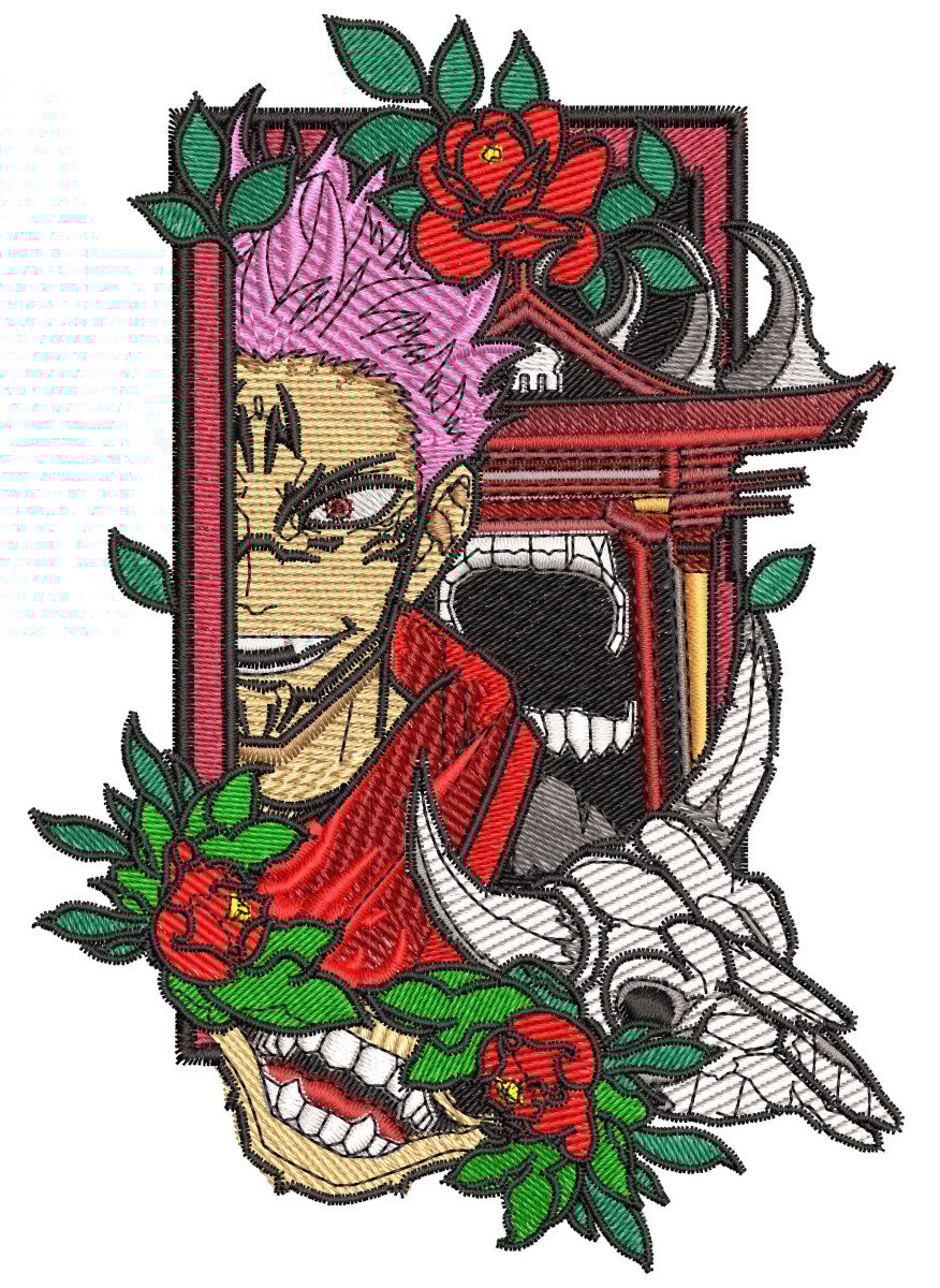This custom anime machine embroidery design and pattern features the Jujutsu Kaisen character Sukuna as he is done in a collage.
